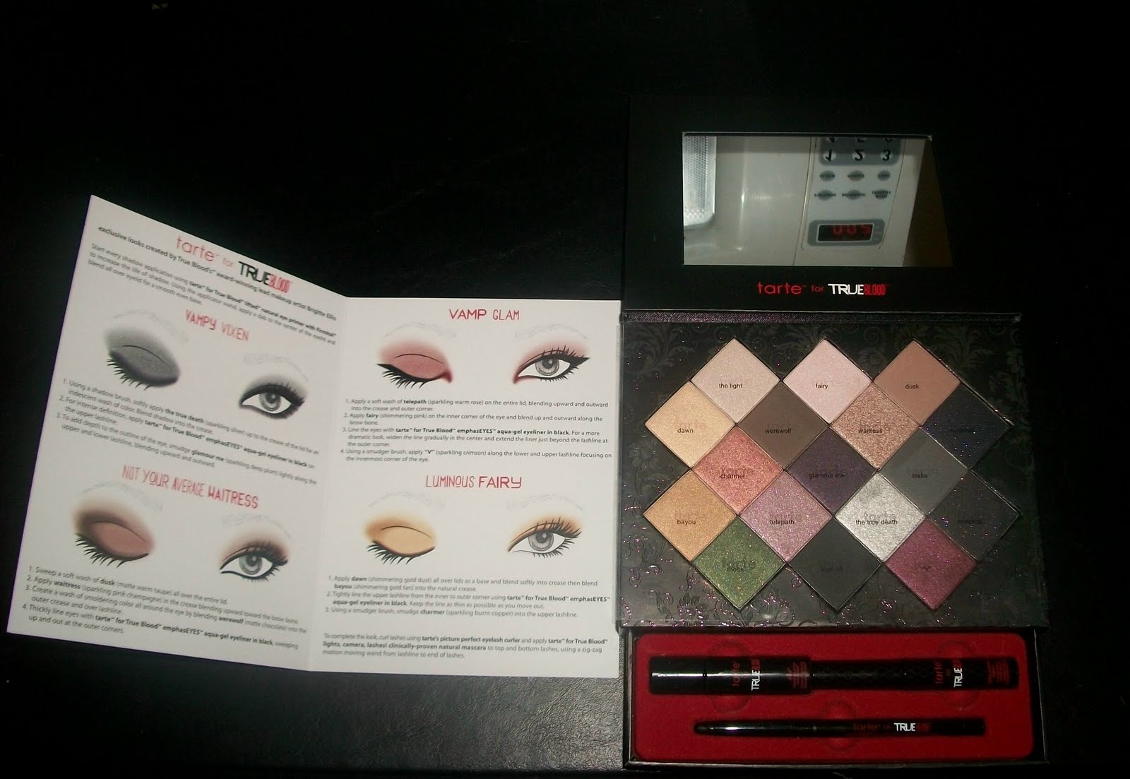 Let me just start this post by saying that when Tarte made the announcement that they were doing an eye pallet inspired by the HBO series True Blood I was totally ecstatic. I have been a big fan of the series since it debuted (as well as the books), and I am in love with Tarte cosmetics. I am also excited about the Lip Surgence lip stain and natural cheek stain as well, but the eye pallet was a MUST HAVE for me. This huge kit comes with 17 full-sized eyeshadows in a wide range of shades as well as a full sized emphasEYES aqua-gel eyeliner,a mini Lifted natural eye primer, and a mini lights, camera, lashes! mascara. At $52 you totally get your money's worth here.
