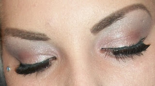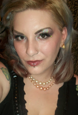 The makeup I chose was easy. A simple silver and black smokey eye. I used the two sparkly black shades in my Tarte pallet to make my crease, Then I packed on Abigail's Boutique Designs Hidden truth all over under the crease and on 2/3rd of the eyelid. I used this shade because it adds an iridescent navy blue sheen as well as some gold tones. The gold tones give the silver on top of it sort of an antiqued color. I packed on Starchild from the Tarina Tarantino Starchild Pallet all over the inner eye and lid. I finished my eyes off using MBA Snow Globe and ABD Ice Queen as a browbone highlight. I kept my blush and lipstick a peachy nude shade with some gold tones.