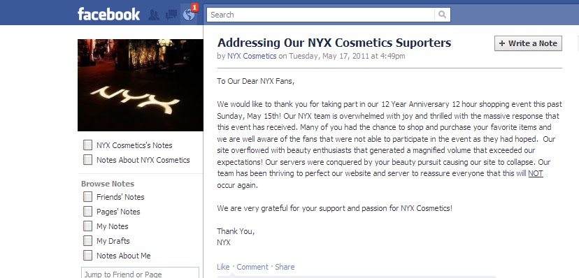 Yesterday I blogged about NYX's pseudo-sale. Since then tons of blogs have been chronicling the saga, several "Boycott NYX" facebook pages have been made, and there is even a twitter dedicated to the scam. I cannot say I am surprised though. I figured that after yesterday when thousands of former customers voiced their distaste with how the situation was handled, NYX would have seen their error and apologized. Haven't they ever heard the expression 'the customer is always right'?