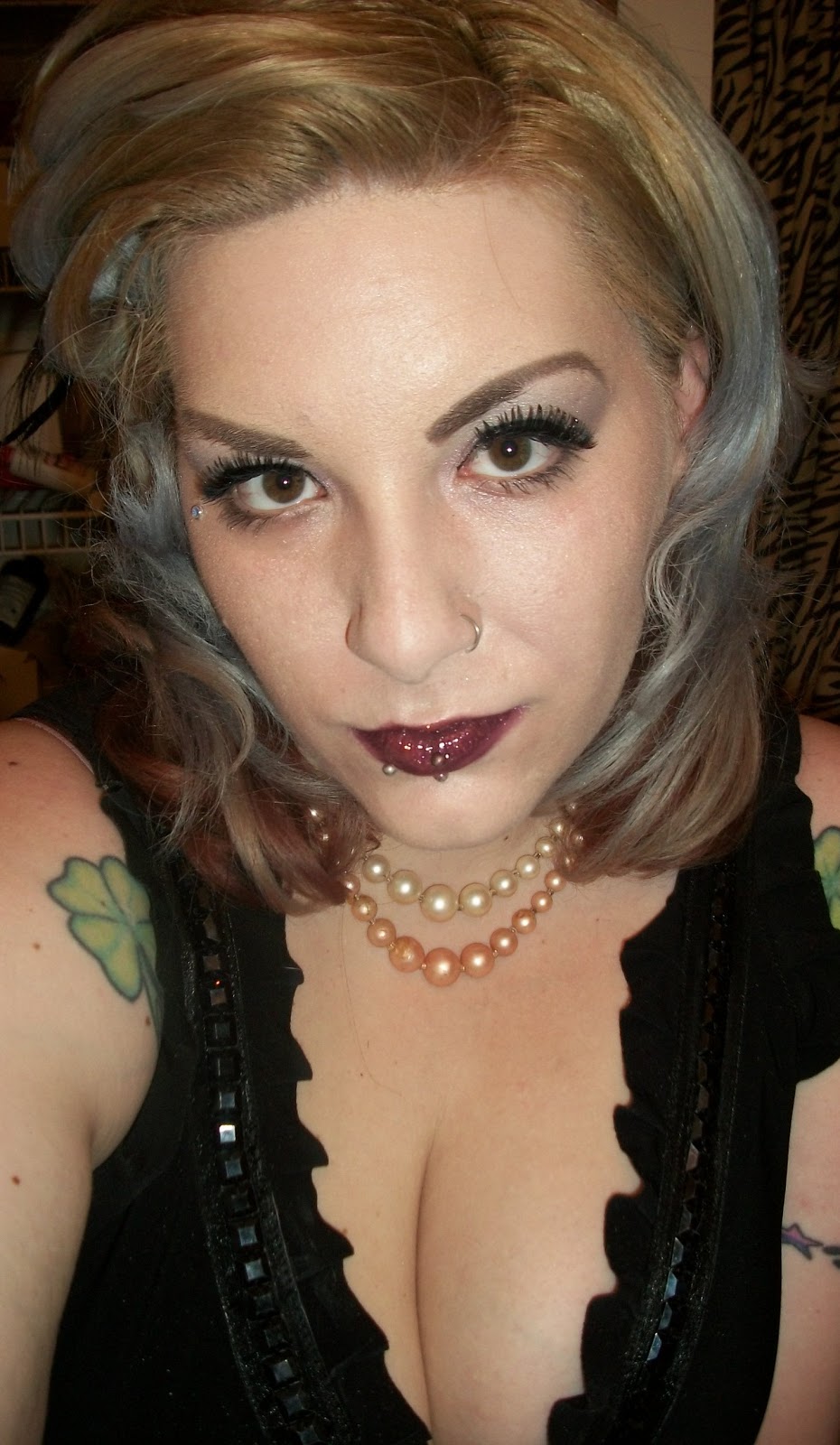 The makeup I chose for this look was a shimmering wine colored eye paired with a matching lip, pale pink blush, and just a little bit of glitter. I started out with a super sparkly deep brown from a company called Jujubeads called 'Dark Soul'. Again I used my Tarte pallet but this time I went for V. and Waitress. Then I used an amazing sparkling white shade from My Beauty Addiction called Snow Globe as a highlight. I finished it off by packing on Abigail Boutique Designs Big Papa. I blended it out and then packed on more Big Papa with a moist brush. I made my own lip gloss by mixing a tiny bit of Big Papa with a clear balm. Adding a little bit of glitter is totally optional.